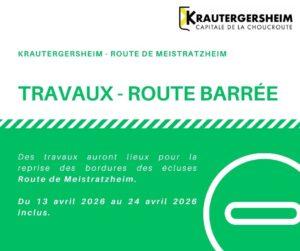 EDIT – Travaux route de Meistratzheim Le démarrage des travaux de reprise des bordures des écluses, situées route de Meistratzheim, initialement prévu à compter de